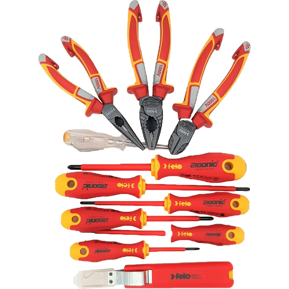 Набор диэлектрических отверток SL/PH, бокорезов, плоскогубцев, длинногубцев, стриппера и отвертки тестера напряжения сети в сумке Felo ERGONIC 41391104 — детальное фото